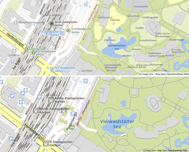 That has opened up numerous new possibilities and allowed us to improve the content and appearance of our maps. The style with the most content is “Multicolor Points of Interest”, which is why we will explain most of the significant changes using this style.