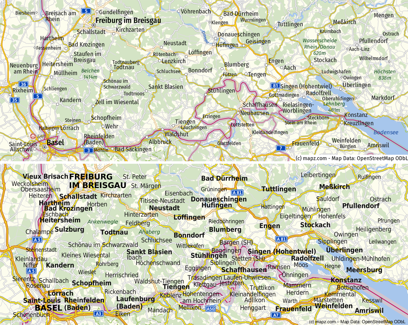 Transparencies: Our newly developed system allows for transparent elements and text. That means elements from lower layers remain visible even when they are covered by border lines or region descriptions (e.g. “Black Forest”).
