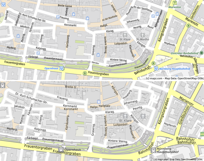 Symbols no longer overlap: Our old system sometimes marked points of interest (e.g. churches) with two overlapping symbols, because they were included in our database as both a point and a building. Our new system filters out such duplicates and reduces overlapping text and symbols to a minimum.